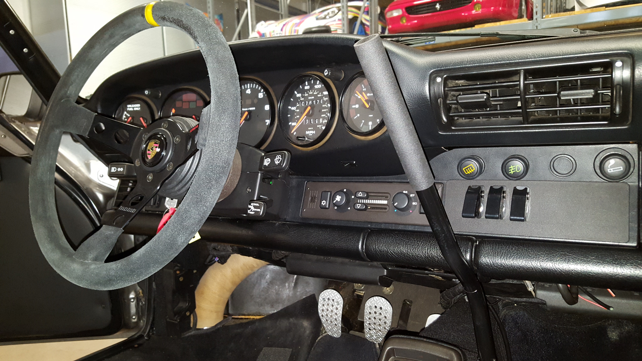 A surprising number of stock interior elements remain, including stock instrumentation, climate control, power windows, and even the stock center console with the original traction control and diff-lock switches. The stock seats have given way to adjustable Recaros, and the stock handbrake has been augmented by a tall hydraulic unit affixed to the side of the center console.